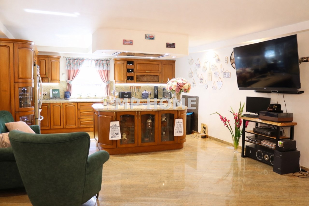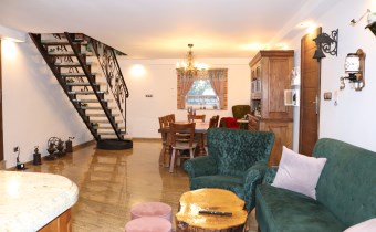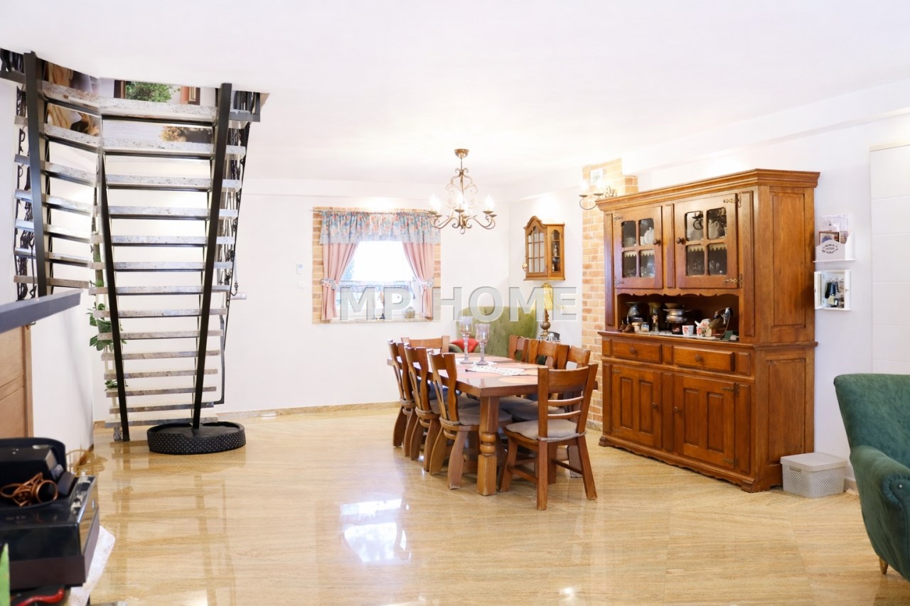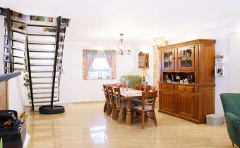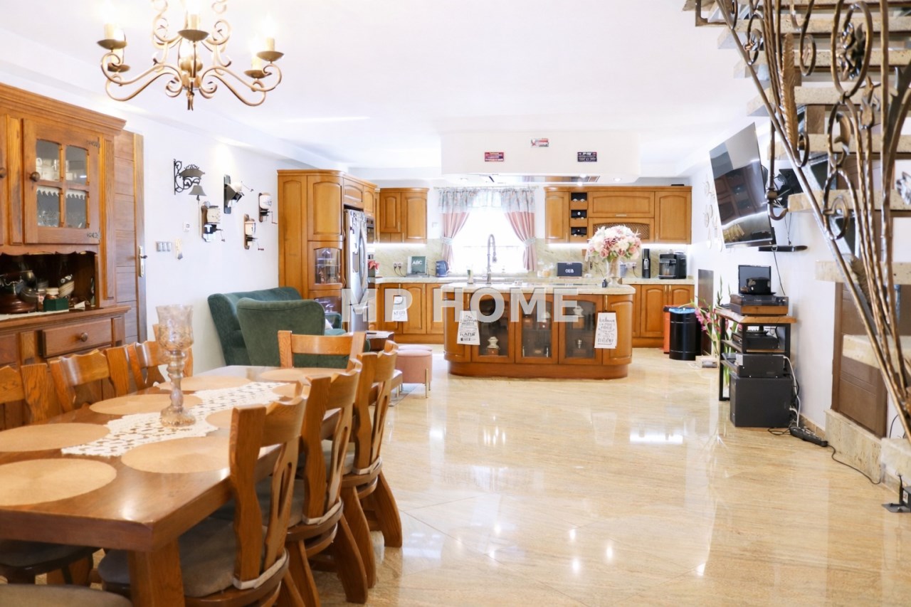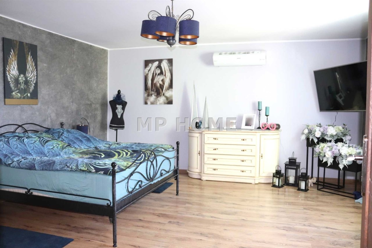 - Liczba pokoi: 5 pokoi, w tym sypialnie, salon z przestronną kuchnią i jadalnią; 2 łazienki + pomieszczenie (pokój) nad garażami;