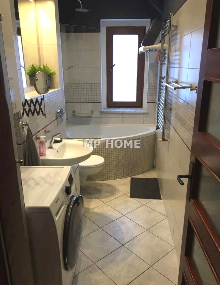 - łazienka z oknem, toaletą i wanną,